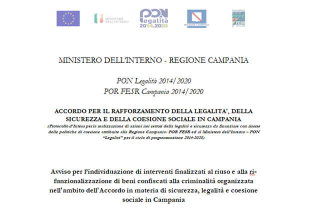 In data 31 ottobre 2017 è stato pubblicato sul sito l’Avviso per l’individuazione di interventi finalizzati al riuso e alla ri-funzionalizzazione di beni confiscati alla criminalità organizzata nell'ambito dell'Accordo in materia di sicurezza, legalità e coesione sociale in Campania, rivolto a 123 Comuni della Regione Campania, per il finanziamento di interventi di recupero dei beni confiscati, con risorse a valere del PON “Legalità” o del POR FESR Campania.