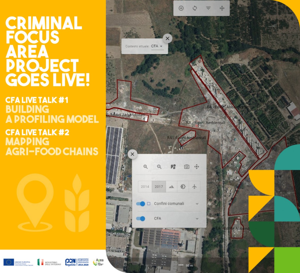 Si sono svolti gli scorsi 25 e 30 giugno i primi due Talk tematici di approfondimento promossi da AGEA nell’ambito del progetto Criminal Focus Area (CFA) finanziato dal PON Legalità FESR FSE 2014-2020. Il progetto ha l’obiettivo di contrastare i fenomeni criminali incidenti sulle aree agricole attraverso supporti decisionali e strumenti di valutazione e controllo per gli “addetti ai lavori”.